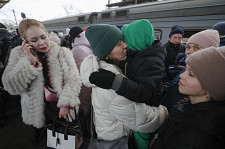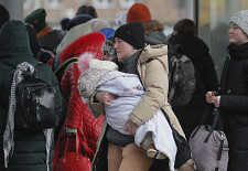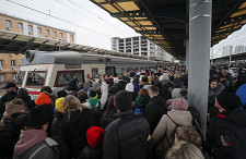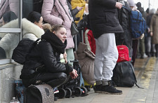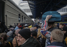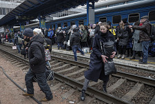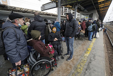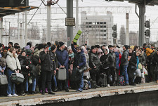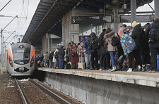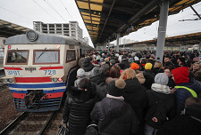 Ludzie próbują wsiąść do pociągu ewakuacyjnego na stacji kolejowej w Kijowie, Ukraina, 5 marca 2022 r.