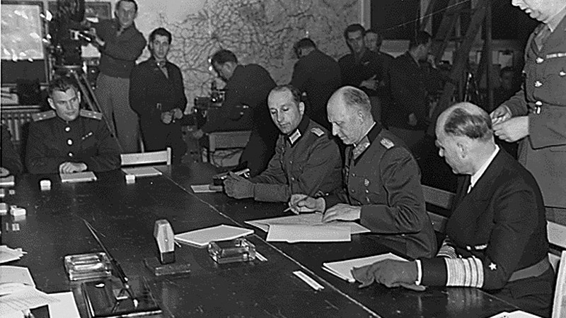 W poniedziałek, 7 maja 1945 r., w kwaterze gen. Dwighta Eisenhowera w Reims zakończyła się II wojna światowa w Europie. Przedstawiciele Niemiec: generał armii Alfred Jodl, admirał Hans-Georg Friedeburg i mjr Wilhelm Oxenius, podpisali akt bezwarunkowej kapitulacji. Ze strony aliantów protokół podpisał gen. Walter Bedell Smith, ze strony Sowietów gen. Iwan Susłoparow.