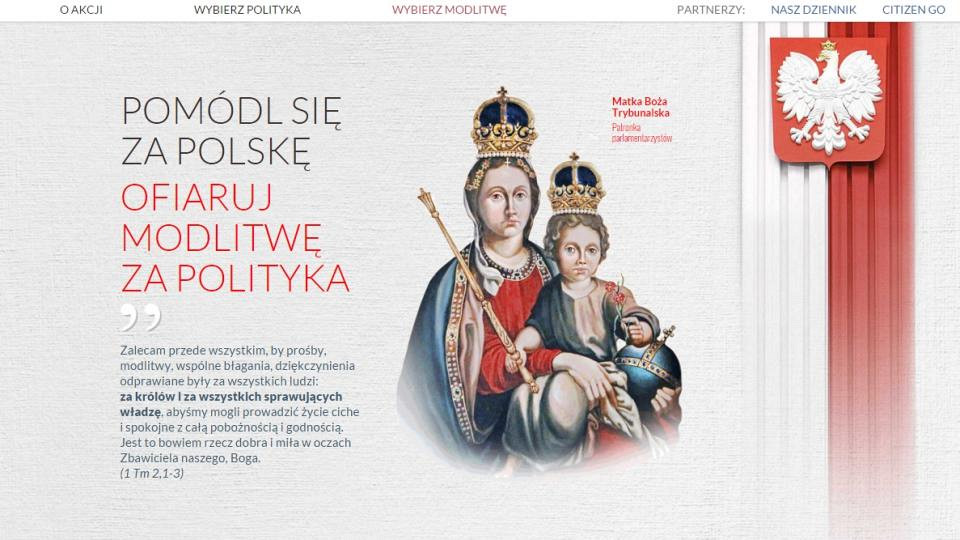 Dziś wraz ze stowarzyszeniem CitizenGo zapraszamy Państwa do codziennej modlitwy w intencji prezydenta, ministrów, posłów i senatorów. Magdalena Korzekwa-Kaliszuk, dyrektor polskiego oddziału CitizenGo, podkreśla, że nasza deklaracja modlitwy to sygnał dla polityka, że jego decyzje są dla nas ważne. Do polecania Bogu rządzących zachęcał wiernych już św. Paweł, wskazując na błogosławione owoce naszych próśb. „Zalecam przede wszystkim, by prośby, modlitwy, wspólne błagania, dziękczynienia odprawiane były za wszystkich ludzi: za królów i za wszystkich sprawujących władzę” (1 Tm 2,1-2).