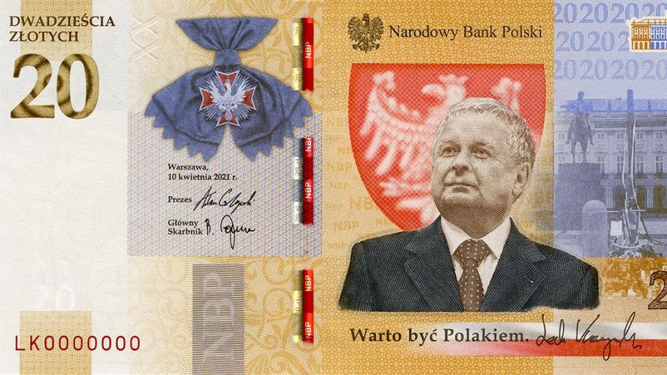 Na przedniej stronie banknotu o nominale 20 złotych został umieszczony portret Prezydenta RP Lecha Kaczyńskiego, wizerunek Orderu Orła Białego oraz Pałacu Prezydenckiego w Warszawie. Z kolei na stronie odwrotnej widnieje budynek Muzeum Powstania Warszawskiego, tłum strajkujących osób w Stoczni Gdańskiej w latach 80. XX w., stylizowany napis „Solidarność” oraz widok Polskiego Cmentarza Wojennego w Katyniu. Banknot zaprojektowany przez Justynę Kopecką posiada najnowocześniejsze zabezpieczenia obecnie dostępne na rynku. Zostanie wyemitowany w nakładzie do 80 tysięcy sztuk, a jego cena emisyjna to sto złotych.