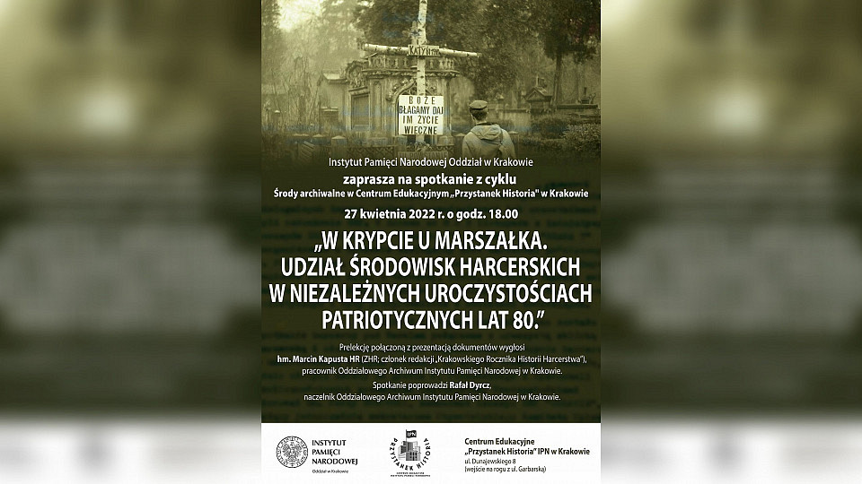 27 kwietnia 2022 r. prelekcję zatytułowaną „W krypcie u Marszałka. Udział środowisk harcerskich w niezależnych uroczystościach patriotycznych lat 80.” wygłosi hm. Marcin Kapusta HR (ZHR; członek redakcji „Krakowskiego Rocznika Historii Harcerstwa”), pracownik Oddziałowego Archiwum IPN w Krakowie. Początek o godz. 18.00, a spotkanie, które poprowadzi kierujący krakowskim Archiwum IPN Rafał Dyrcz, będzie także transmitowane na Facebooku.