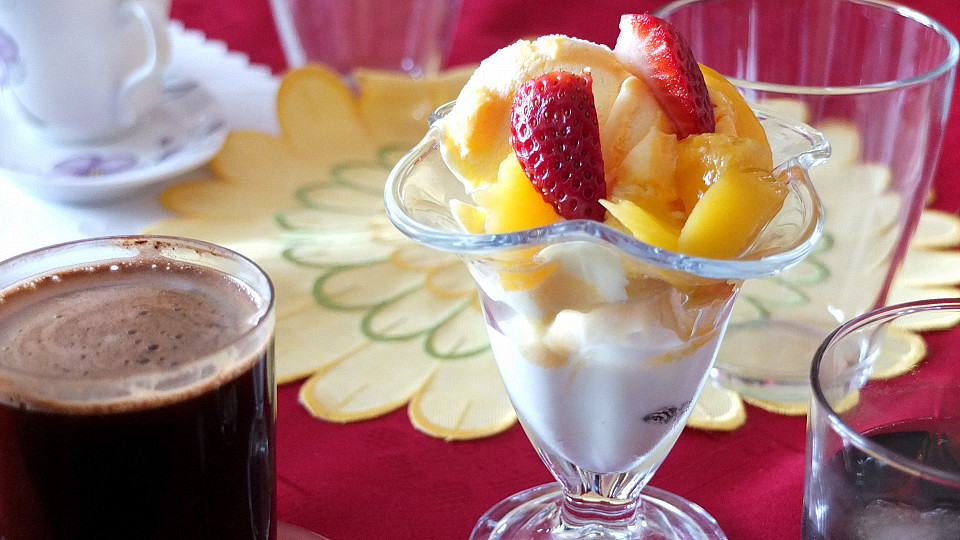 Truskawki myjemy, odszypułkowujemy i zostawiamy na sicie, żeby ociekły z wody. Kilka truskawek odkładamy do dekoracji. Na dnie szklanego naczynia rozkładamy połowę lodów, a następnie połowę truskawek. Na truskawki wykładamy resztę lodów, a na koniec pozostałe truskawki. Deser wkładamy do zamrażarki. W tym czasie śmietanę ubijamy na sztywno z cukrem pudrem i łączymy z likierem. Przekładamy do rękawa cukierniczego i dekorujemy deser. Na wierzchu rozkładamy pozostałe truskawki. Podajemy od razu po przygotowaniu.