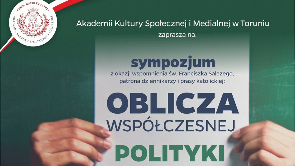 Sympozjum pt. „Oblicza współczesnej polityki” będzie miało miejsce w gościnnych murach Akademii Kultury Społecznej i Medialnej, ul. Starotoruńska 3, Toruń. Rejestracja pod numerem telefonu: 56 650 40 00.