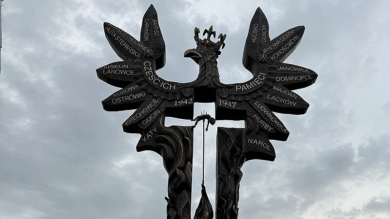 Pomnik „Rzeź Wołyńska” został odsłonięty w lipcu 2024 r. Odlana w brązie rzeźba przedstawia orła, którego korpus jest umieszczony w płomieniach, a na skrzydłach wypisano nazwy miejscowości, których mieszkańcy zostali wymordowani przez UPA. W środku monumentu znajduje się wycięty krzyż, a w nim trójzębne widły, na które nabite jest ciało dziecka. U podstawy pomnika z jednej strony znajduje się rodzina z dziećmi w płomieniach, a z drugiej - także w płomieniach – głowy dzieci nabite na sztachety płotu. Pomnik wraz z cokołem mierzy 20 metrów wysokości.