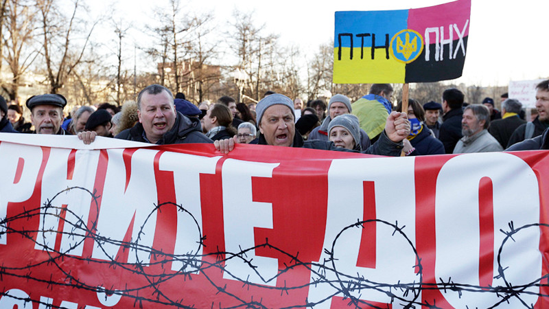 Uczestnicy tego wiecu, pytani o cokolwiek, odpowiadają, powtarzając niemal dosłownie argumenty prezydenta Putina z ubiegłotygodniowej konferencji. Te same idee reprodukują od kilku tygodni wszystkie główne kanały telewizyjne i gazety. Mówi się o dyskryminacji Rosjan na Ukrainie. Miałaby ona polegać na „zakazie języka rosyjskiego, niszczeniu pomników Lenina i pozbawieniu funkcjonariuszy Berkutu emerytur”. Z tego wszystkiego prawdziwe jest tylko to, że zburzono kilka pomników wodza ludobójczej rewolucji i rozformowano Berkut.