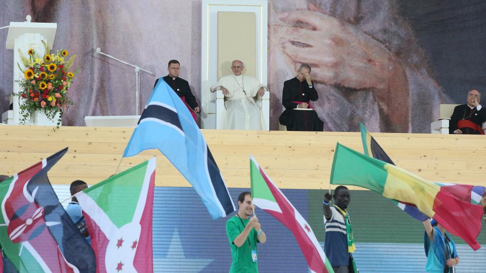 W ojczystej ziemi św. Jana Pawła II chciałbym mu podziękować za to, że wymarzył i dał impuls do tych spotkań. Towarzyszy nam on z Nieba, gdy widzimy wielu młodych ludzi z tak różnych narodów, kultur, języków, przybyłych jedynie z jednego powodu: aby świętować żywą obecność Jezusa pośród nas. Zrozumieliście? Świętować Jezusa, który żyje pośród nas. A stwierdzenie, że On żyje, oznacza chęć ponowienia naszego pragnienia pójścia za Nim, naszego pragnienia, by żyć żarliwie naśladowaniem Chrystusa. Czy jest jakaś lepsza okazja, by odnowić naszą przyjaźń z Jezusem niż umocnienie przyjaźni między wami! Czy istnieje jakiś lepszy sposób umocnienia naszej przyjaźni z Jezusem niż dzielenie jej z innymi! Czyż jest lepszy sposób, by doświadczyć radości Ewangelii niż chęć „zarażenia” Jego Dobrą Nowiną w wielu sytuacjach bolesnych i trudnych!