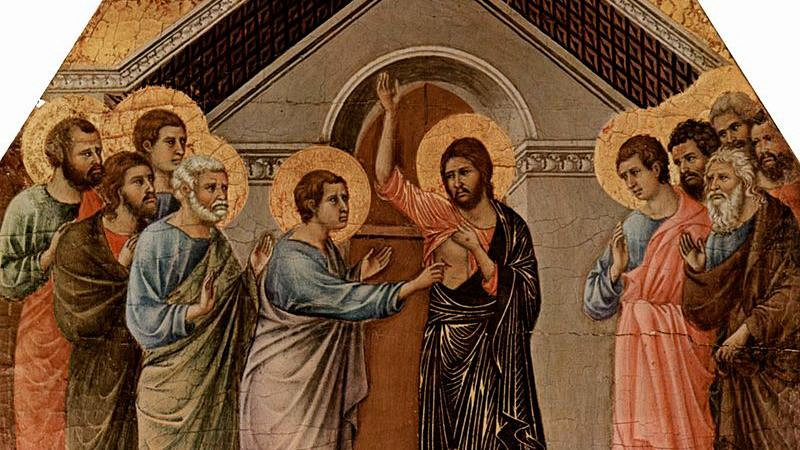 A po ośmiu dniach, kiedy uczniowie Jego byli znowu wewnątrz domu i Tomasz z nimi, Jezus przyszedł, choć drzwi były zamknięte, stanął pośrodku i rzekł: „Pokój wam!”. Następnie rzekł do Tomasza: „Podnieś tutaj swój palec i zobacz moje ręce. Podnieś rękę i włóż w mój bok, i nie bądź niedowiarkiem, lecz wierzącym”.