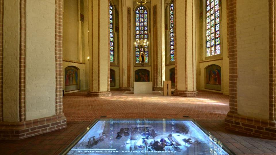Specjalna instalacja wykonana na zewnątrz kościoła w skali 1:1 odzwierciedla zarys kaplicy księżnej Dobrawy i księcia Mieszka I.