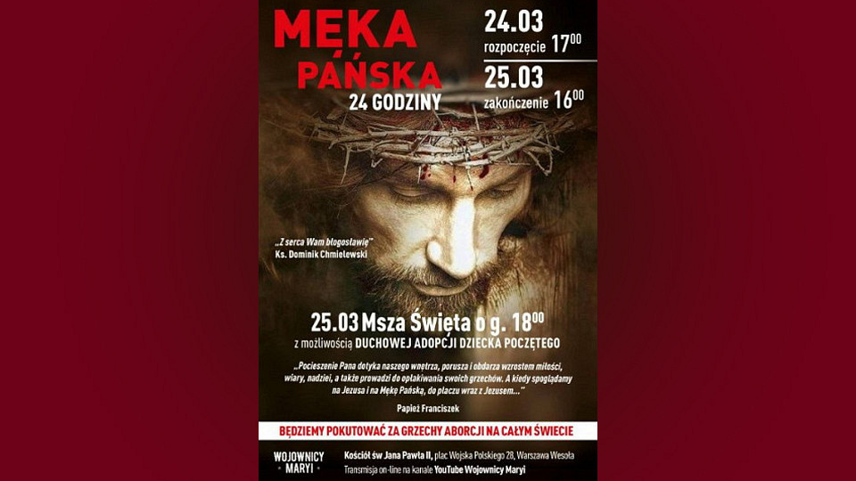 Czuwanie rozpocznie się 24 marca o godz. 17.00. Podczas niego wierni bedą pokutować za grzechy aborcji na całym świecie. Wydarzenie zakończy się 25 marca o godz. 16.00. Następnie o godz. 18.00 zostanie odprawiona Msza Święta z możliwością duchowej adopcji dziecka poczętego.