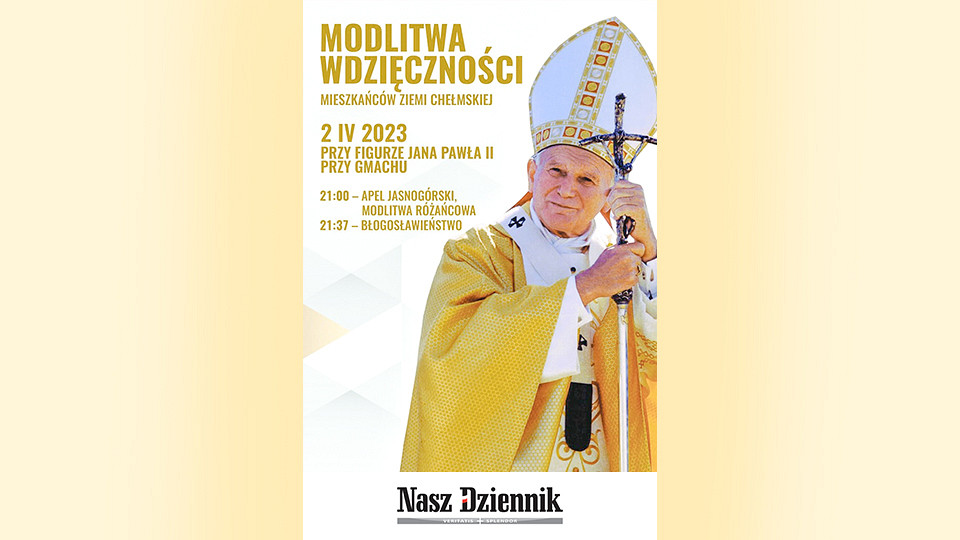 Serdecznie zapraszamy wszystkich 2 kwietnia (niedziela) na spotkanie – „Modlitwę wdzięczności” przy pomniku św. Jana Pawła II w Chełmie przy pl. Niepodległości.