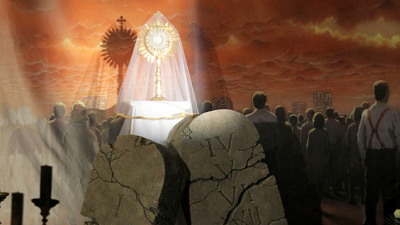 W trakcie tej wieczerzy Pan Jezus wziął chleb, odmówił błogosławieństwo, połamał i dał dwunastu, mówiąc: «Bierzcie, to jest Ciało moje». „Potem wziął kielich i odmówiwszy dziękczynienie dał im, i pili z niego wszyscy. I rzekł do nich: «To jest moja Krew Przymierza, która za wielu będzie wylana. Zaprawdę, powiadam wam: Odtąd nie będę już pił z owocu winnego krzewu aż do owego dnia, kiedy pić go będę nowy w królestwie Bożym»” (Mk 14, 23-25).