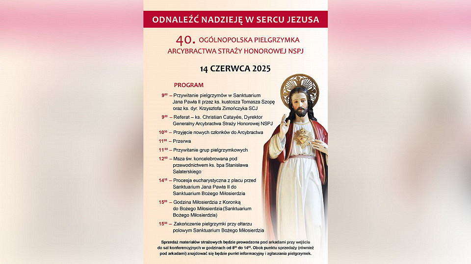 W sobotę 14 czerwca br. odbędzie się 40. Ogólnopolska Pielgrzymka Arcybractwa Straży Honorowej Najświętszego Serca Pana Jezusa pod hasłem „Odnaleźć nadzieję w Sercu Jezusa”. Słowa te są parafrazą myśli Papieża Franciszka zawartej w bulli „Spes non confundit” i nawiązują do hasła trwającego obecnie Roku Jubileuszowego 2025 „Pielgrzymi nadziei”.
