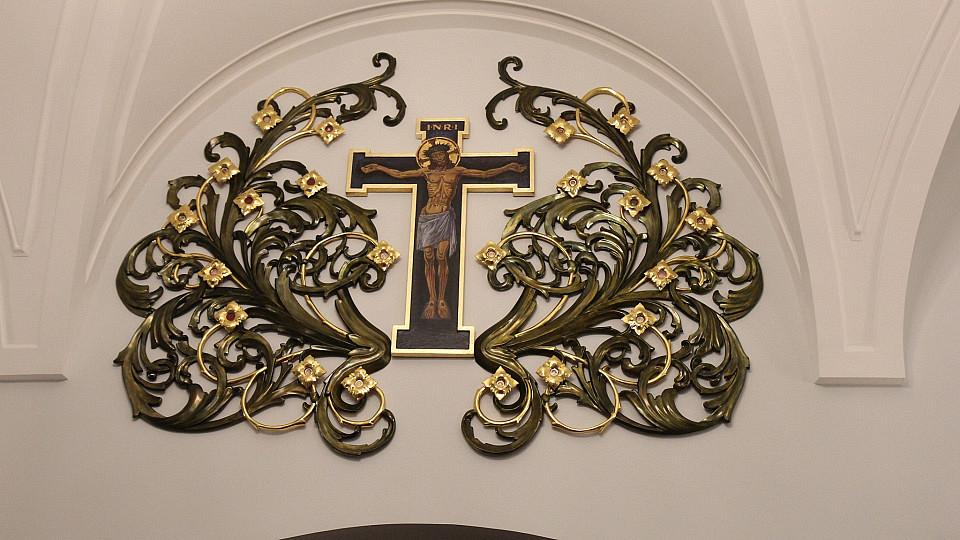 z wyeksponowaną w centralnej części postacią Ukrzyżowanego. Kompozycję uzupełnia stylizowana