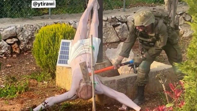 Na fotografii, udostępnionej przez dziennikarza i uwierzytelnionej przez Siły Obronne Izraela, widać żołnierza rozbijającego figurę Jezusa ciężkim młotem.