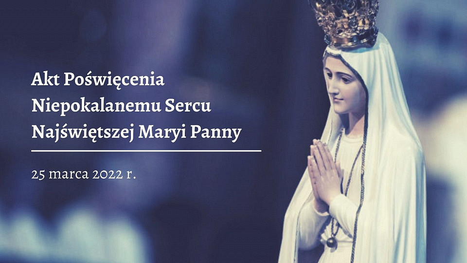 My zatem, Matka Boga i nasza Matko, uroczyście zawierzamy i poświęcamy Twojemu Niepokalanemu Sercu siebie samych, Kościół i całą ludzkość, a zwłaszcza Rosję i Ukrainę. Przyjmij ten nasz akt, którego dokonujemy z ufnością i miłością; spraw, aby ustały wojny, i zapewnij światu pokój. Niech „tak”, które wypłynęło z Twojego Serca, otworzy bramy dziejów dla Księcia Pokoju; ufamy, że poprzez Twoje Serce, nastanie jeszcze pokój. Tobie więc poświęcamy przyszłość całej rodziny ludzkiej, potrzeby i oczekiwania narodów, niepokoje i nadzieje świata.