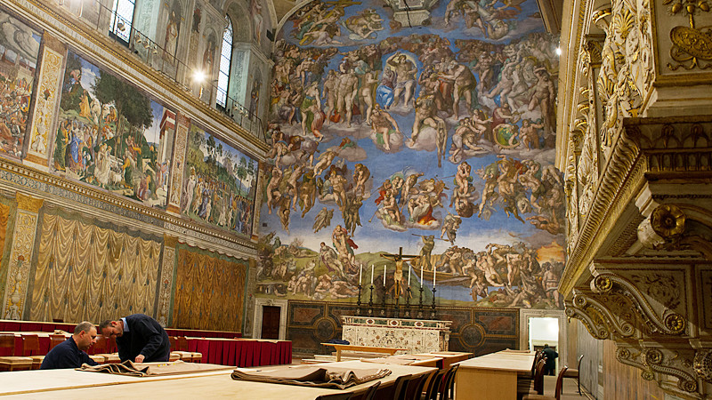 W związku z tym warto zwrócić uwagę na „Sąd Ostateczny” Michała Anioła, na który z pewnością będą patrzeć wybierający Papieża kardynałowie. Artysta ukazuje sprawiedliwych i potępionych. Dusze sprawiedliwych unoszą się do nieba za sprawą modlitwy różańcowej. Dusze przerażonych, potępionych grzeszników porywane są do piekieł.